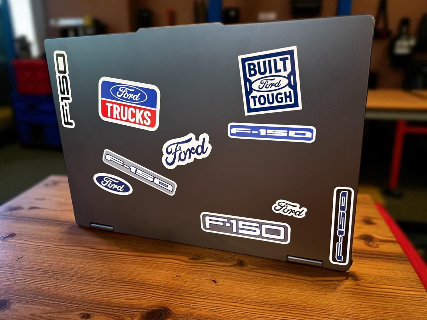 11 HIGH-QUALITY VINYL DECALS – A variety of Ford and F-150 logos, including Built Ford Tough designs, perfect for customizing gear or vehicles.