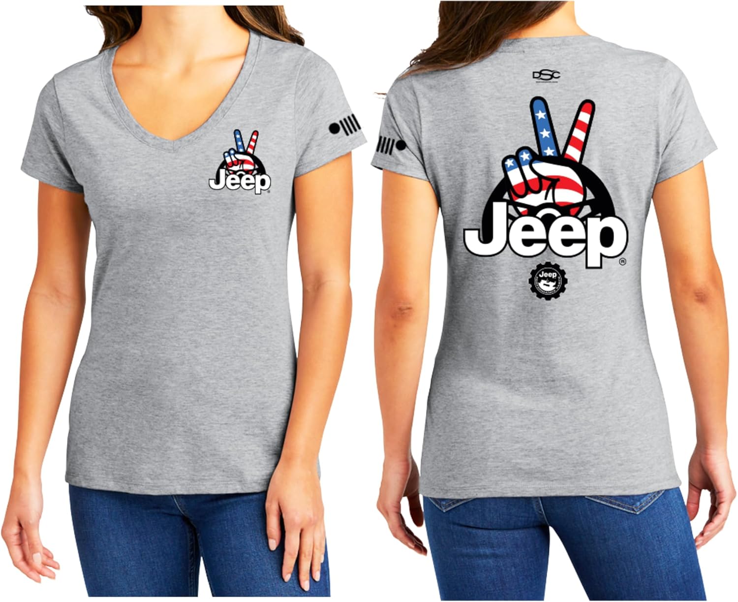 Jeep Ladies Wave USA Logo V-Neck T-Shirt – Light Grey, Soft Cotton Blend, Patriotic Wave Design, Iconic Grille Sleeve Logo