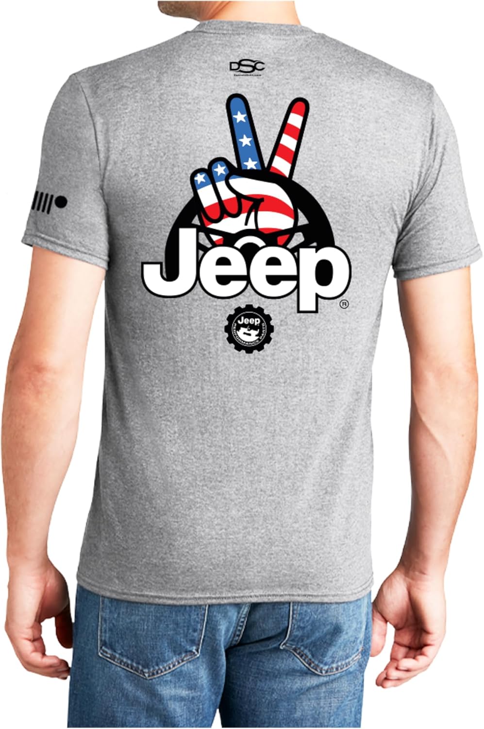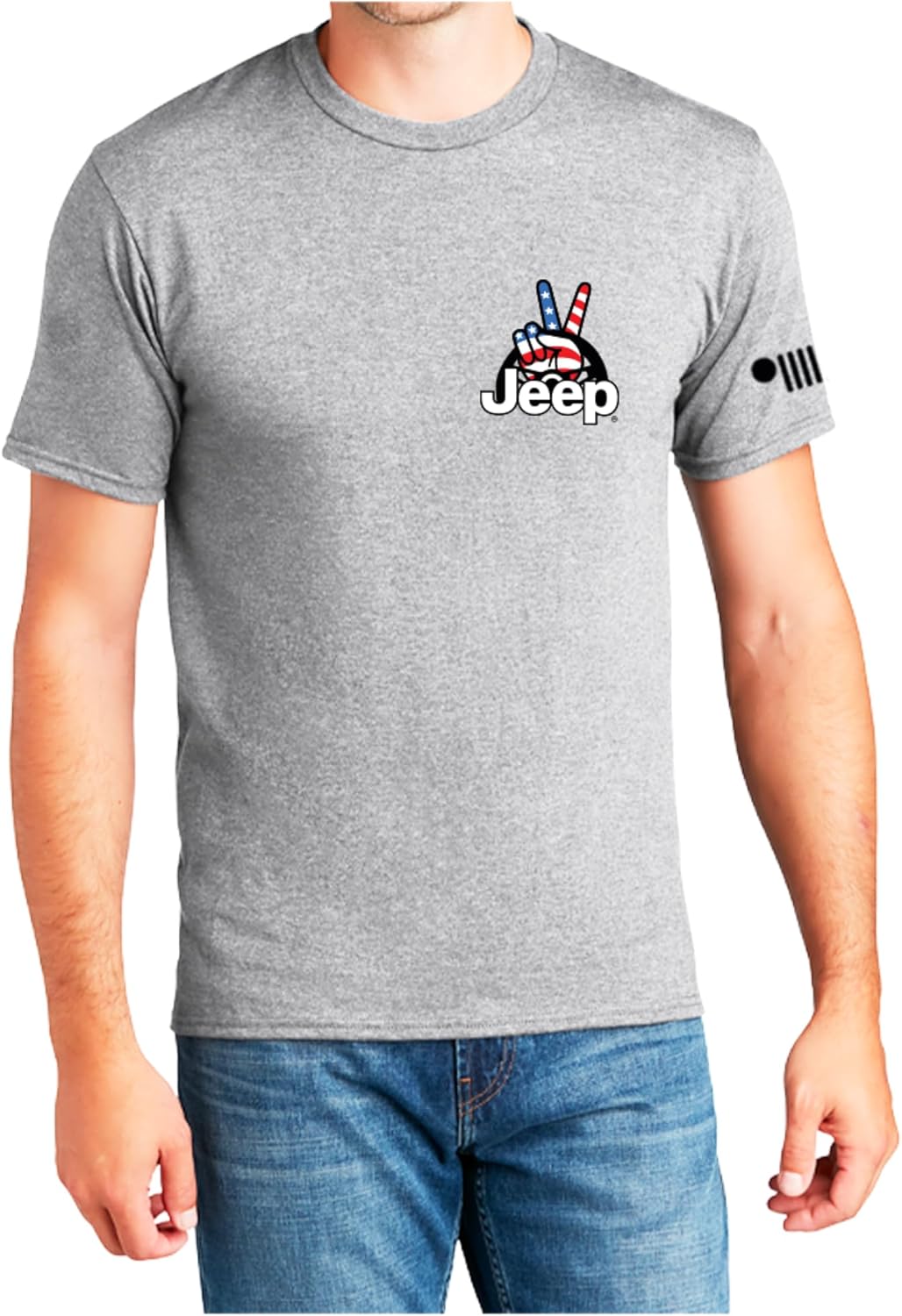 Officially licensed Jeep Wave T-shirt for men – a bold, patriotic design celebrating Jeep culture. This soft cotton-blend tee features a large American flag-inspired Jeep Wave graphic on both the front and back, plus the iconic 7-slot grille and headlight print on the sleeve.